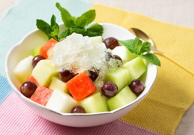 - Prepare the Fruit: Peel and dice the watermelon, cantaloupe, and Galia melon into bite-sized cubes. Wash the grapes and remove any stems. Distribute all the fruit evenly among six bowls.